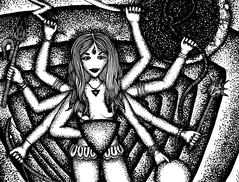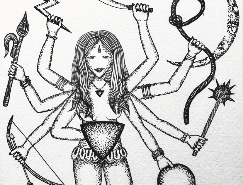I followed a set of descriptions about their physical appearance that guided me, for example with how many arms or faces they might have. The given descriptions include nakedness which felt so welcome in this moment of freeing the feminine, but do not include showing their vulvas, which many of my drawings do. That was my choice; it felt resonant that they be able to show their full selves unapologetically, and not in an antagonistic or sexual way, simply celebrating all of who they are instead of what they have been allowed to be.